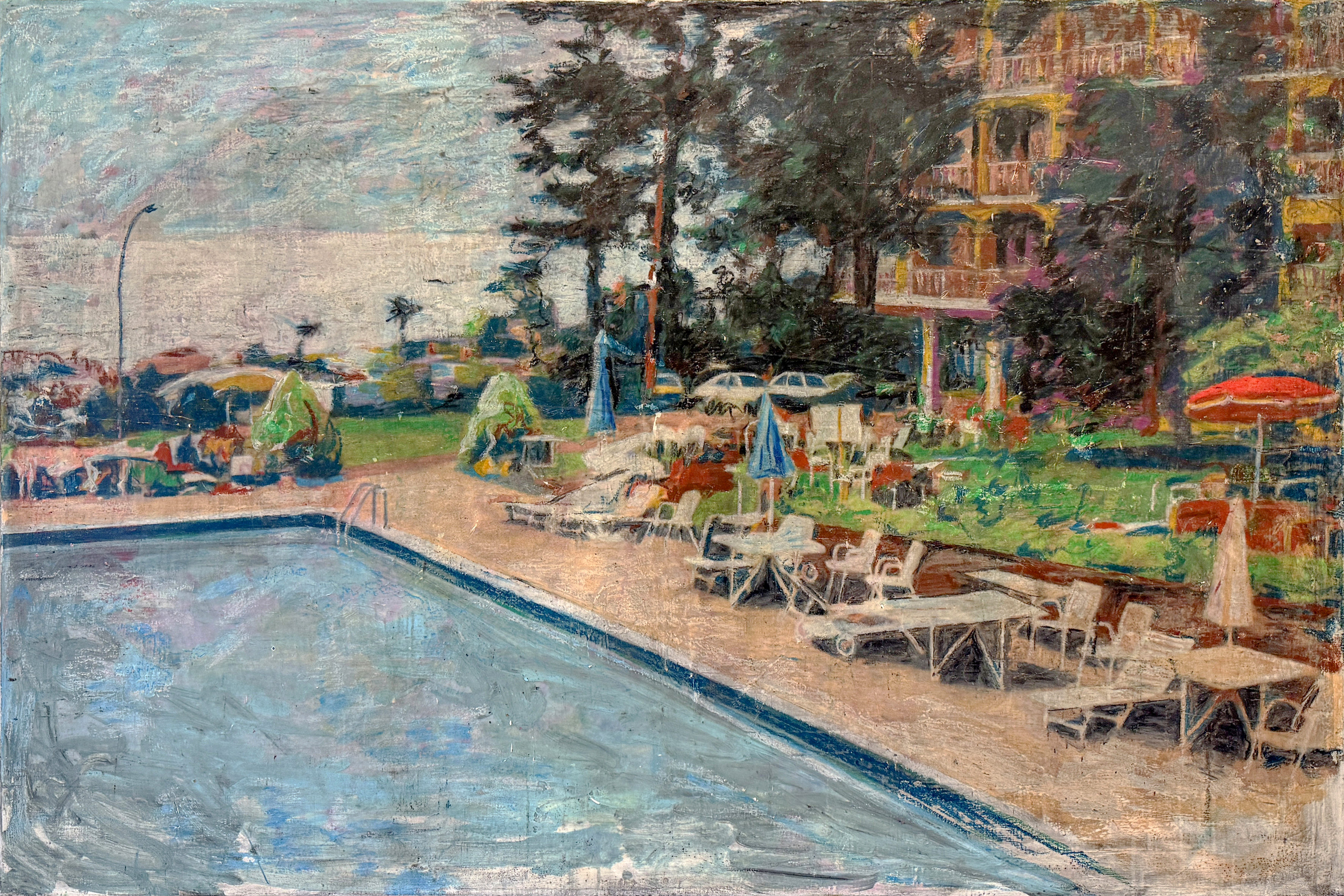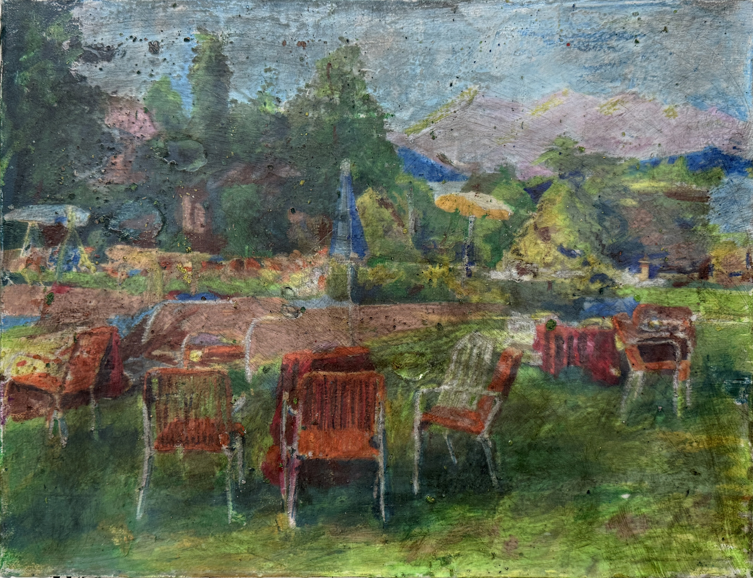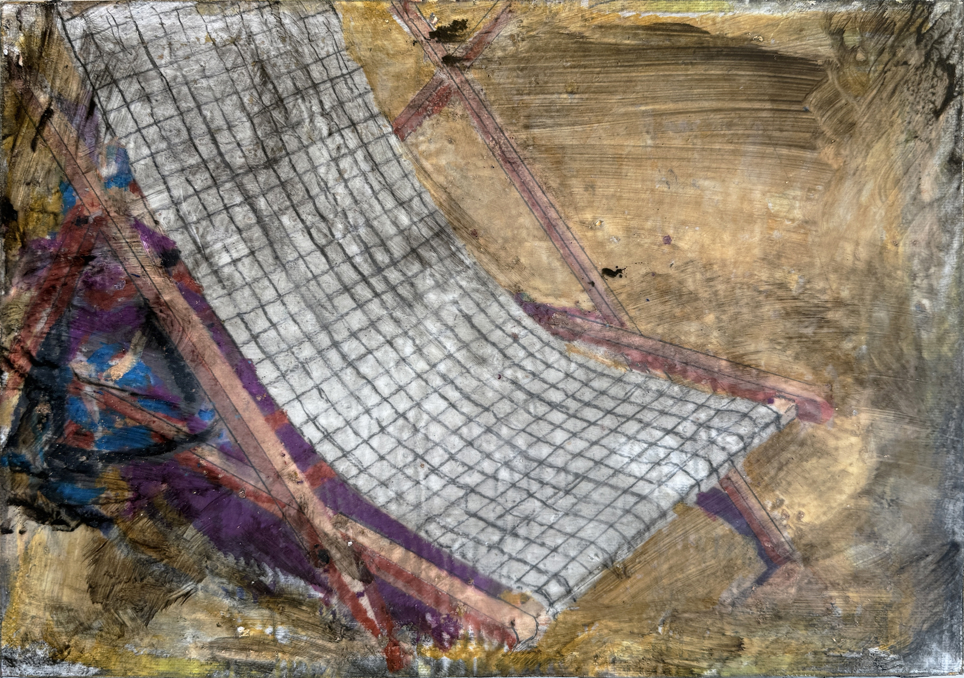 De gekleurde ondertoon fungeert als sluier, een pseudo-documenterende tactiliteit die de herinnering niet illustreert maar net laat doorschemeren tussen de verflagen.
