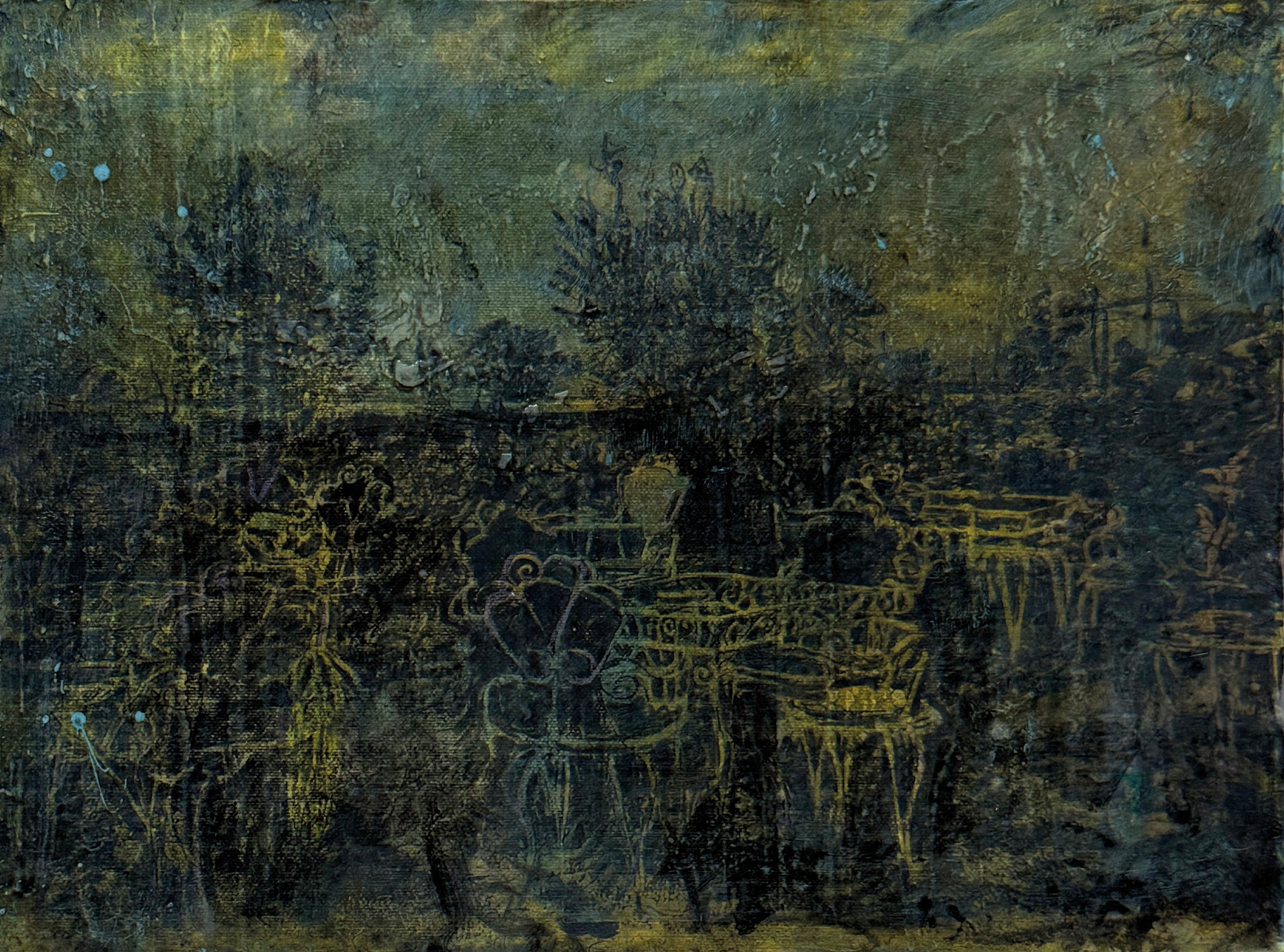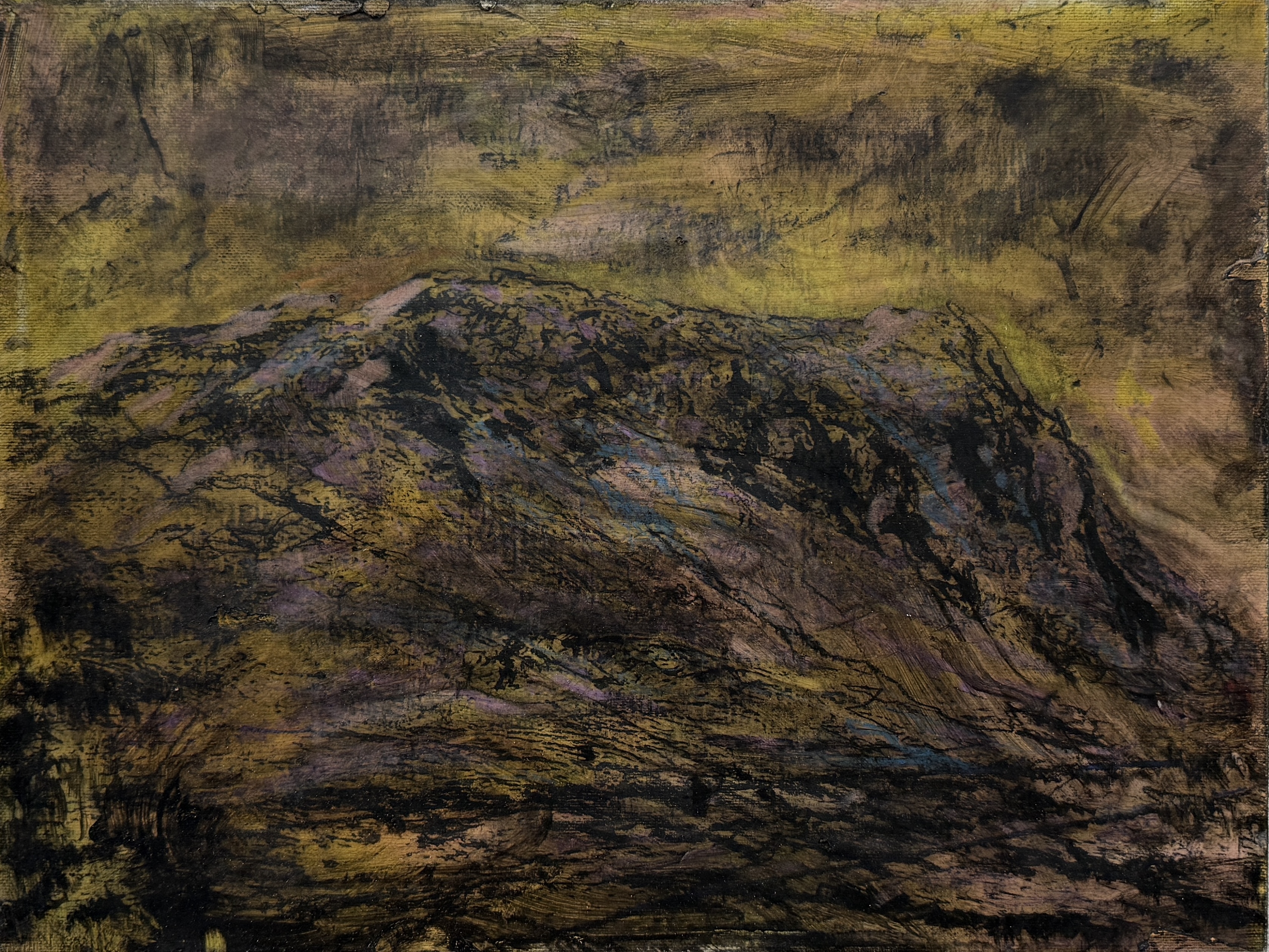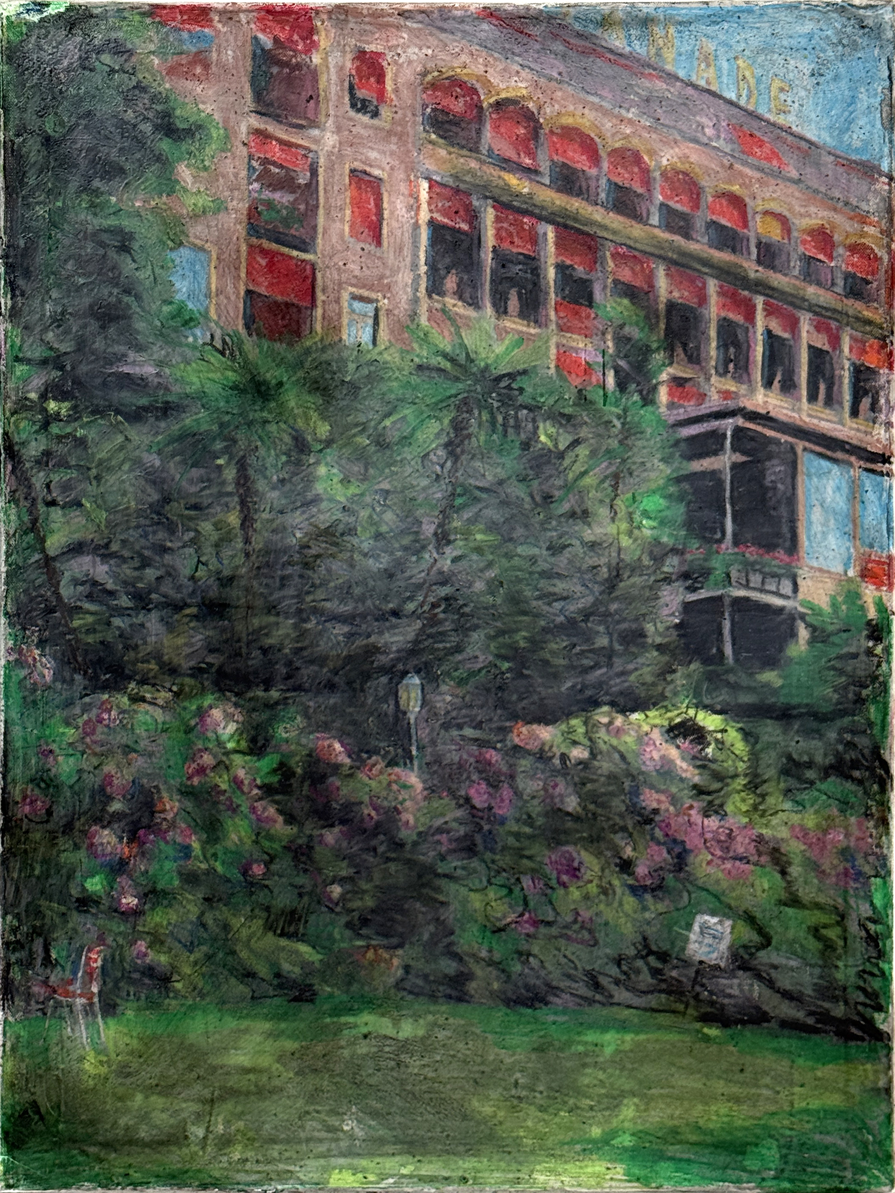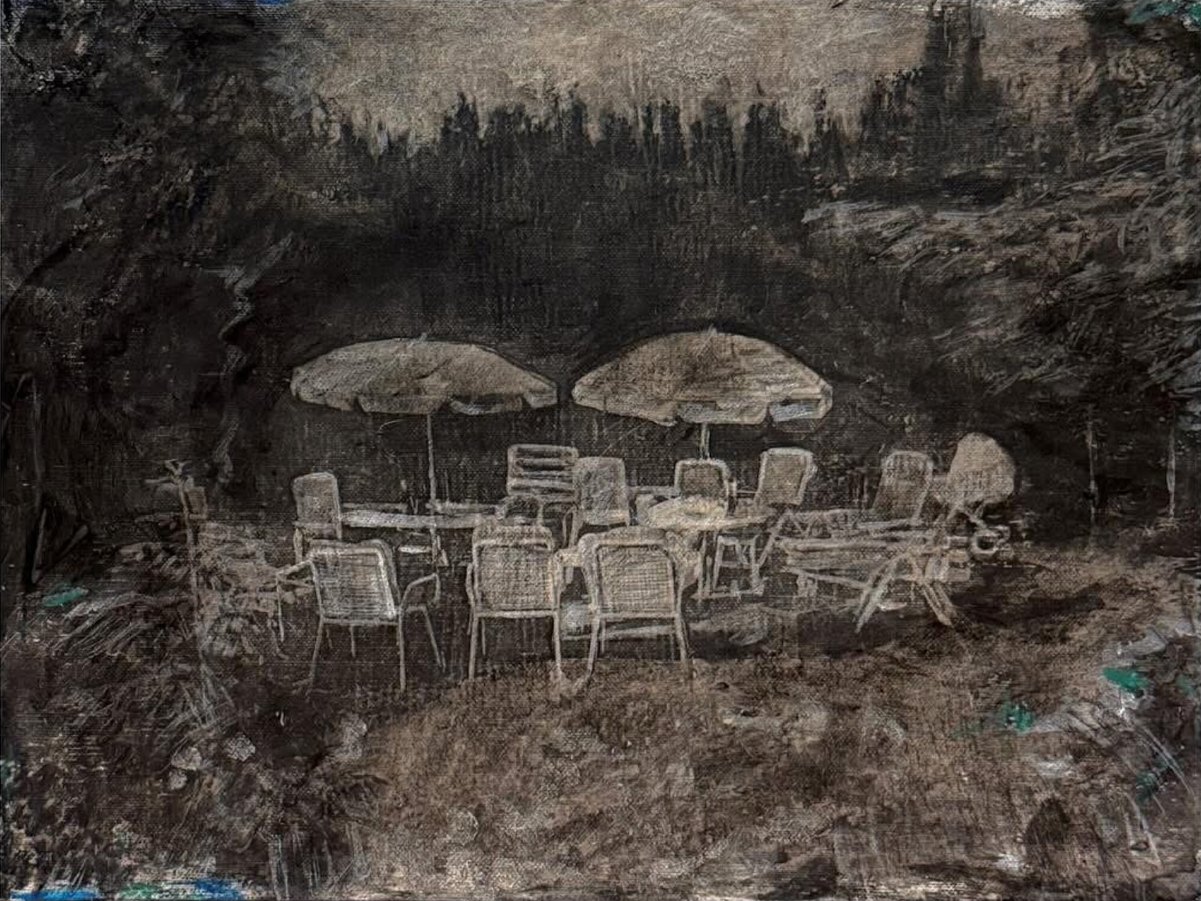 De gekleurde ondertoon fungeert als sluier, een pseudo-documenterende tactiliteit die de herinnering niet illustreert maar net laat doorschemeren tussen de verflagen.